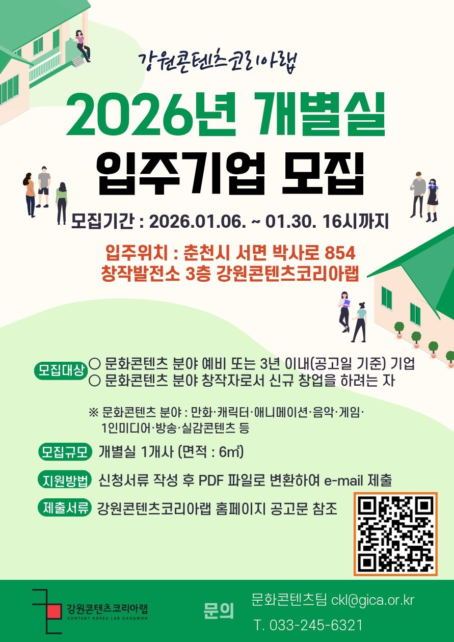 [홍보협조] 2026년 강원콘텐츠코리아랩 입주기업(개별실) 모집 공고